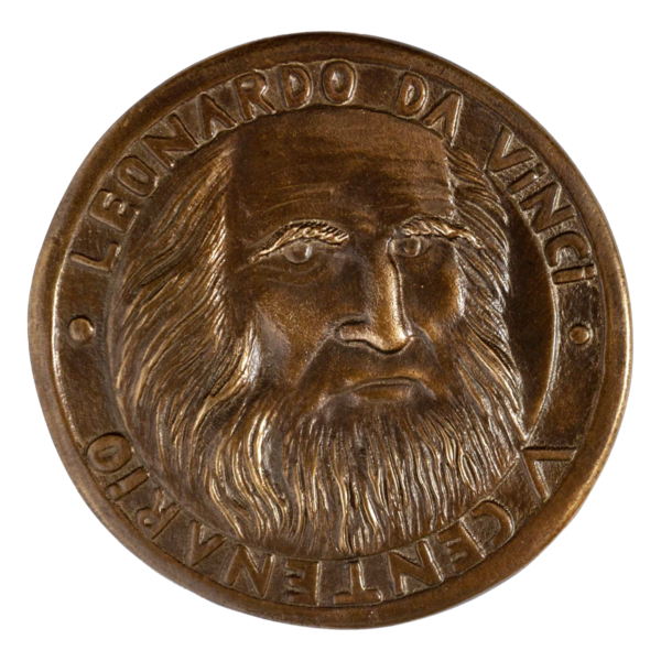 Medaille zum Gedenken an das florentinische Universalgenie Leonardo da Vinci. Vorderseite: Abbildung von Leonardo da Vinci. Rückseite: Abbildung des vitruvianischen Menschen. Material: Bronze. Präsentation: Granat SamtEtui.